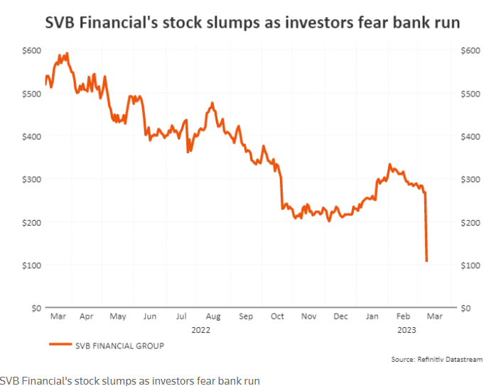 SVB announced on Thursday that it would sell $2.25bn in common equity and preferred convertible stock to fill its funding hole. Its shares ended trading on the day down 60%, as investors fretted that the deposit withdrawals might push it to raise even more capital.