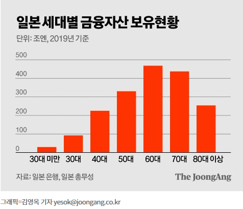 일본 개인의 예금 및 주식 등 금융자산은 2000조 엔(약 1경9326조원)에 달하는데, 이 중 약 63%를 60세 이상이 보유