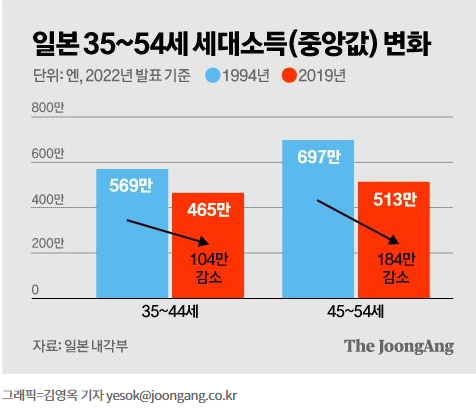 반면에 3050은 부모 세대에 비해 현저히 가난하다. 일본 내각부가 1994년과 2019년의 연령별 가구소득을 비교했는데, 25년의 세월이 흘렀음에도 중년 세대의 소득은 크게 줄어든 것으로 나타났다. 35~44세의 연소득은 1994년에 비해 2019년엔 104만 엔이 감소했고, 45~54세에선 무려 184만 엔이 줄어들었다.