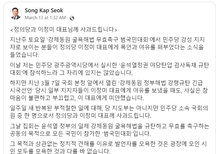 송갑석 민주당 의원의 사과문.