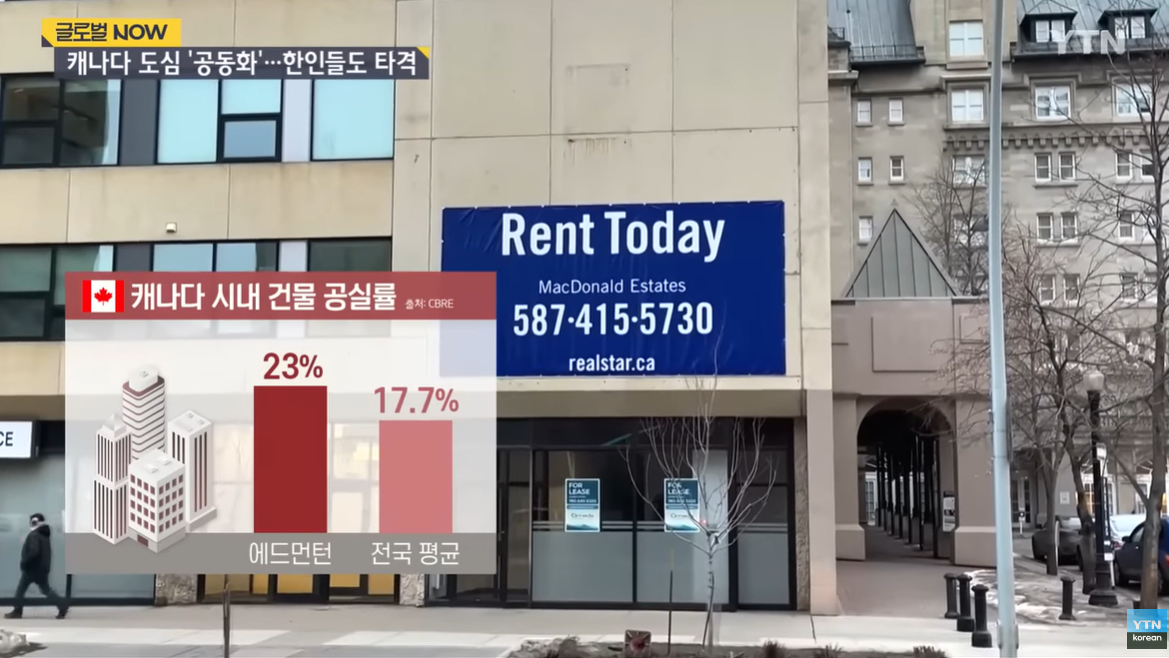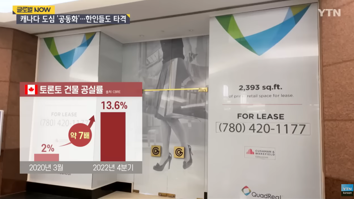 2020년 3월 2%에 불과했던 토론토의 사무용 건물 공실률은 지난해 4분기에 13.6%로 7배 가까이 급등했고, 같은 기간 조사된 에드먼턴의 공실률은 23%, 전국 평균은 17.7%에 이릅니다.