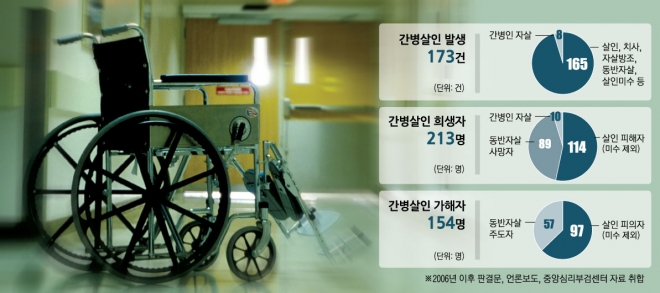 2006년부터 올해까지 ‘간병살인’에 희생(동반 자살자 포함)된 사람들이다. 이 가운데 114명은 가족의 손에 생을 마감했다. 가족을 살해하고 스스로 목숨을 끊거나 동반 자살을 선택한 이들은 89명이다. 환자를 남기고 자신만 극단적 선택을 한 이들도 10명이었다. 한 해에 16.4명, 한 달에 1.4명이 간병살인으로 목숨을 잃었다.