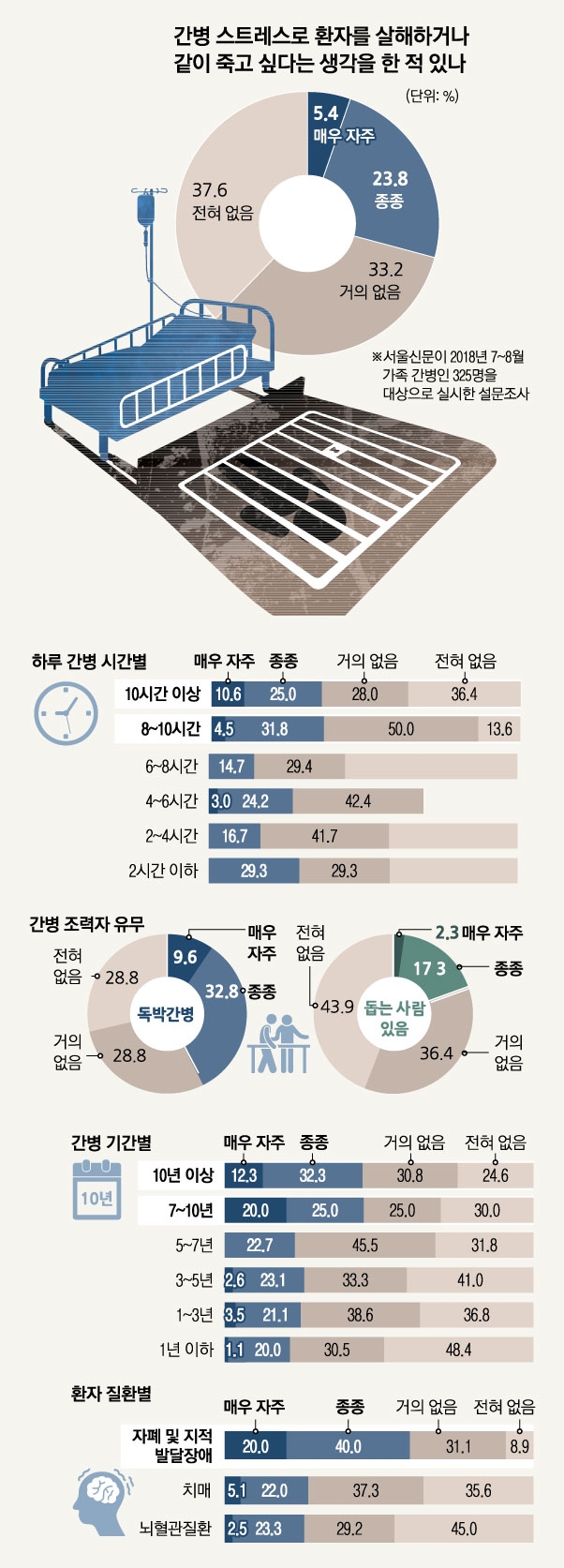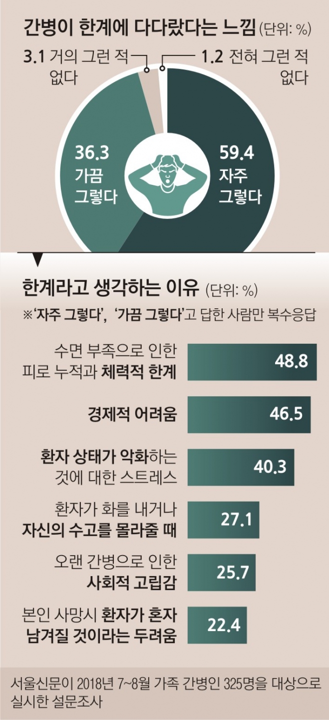 서울신문이 지난 7~8월 한국치매협회, 뇌질환환우모임 등과 공동으로 가족 간병인 325명을 대상으로 간병의 어려움에 대해 설문조사를 실시한 결과 95.7%가 “간병으로 신체와 정신 모두 한계에 몰리고 있다고 느낀 적이 있다”(자주 그렇다 59.4%, 가끔 그렇다 36.3%)고 답했다. 살인 내지는 자살 충동을 느낀다고 답한 응답자도 29.2%에 이르렀다. 이들은 ‘간병으로 인한 정신적·신체적 한계’(60.2%·복수 응답), ‘경제적 어려움의 심화’(50.6%), ‘미래에 대한 불안감’(45.8%) 등이 몰려올 때 환자를 죽이거나 같이 죽고 싶다는 생각을 했다(매우 자주 5.4%, 종종 23.8%)고 밝혔다.