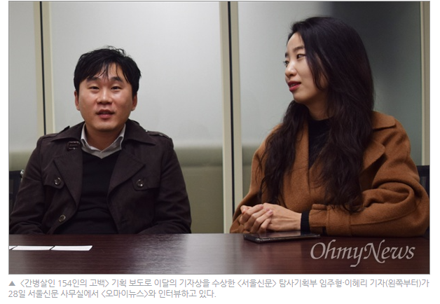 큰사진보기<간병살인 154인의 고백> 기획 보도로 이달의 기자상을 수상한 <서울신문> 탐사기획부 신융아·이성원 기자(왼쪽부터)가 28일 서울신문 사무실에서 <오마이뉴스>와 인터뷰하고 있다.
