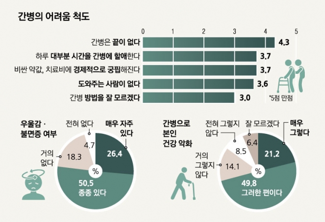간병 가족들을 가장 힘들게 하는 건 악몽 같은 현실이 언제 끝날지 모른다는 점이었다. 간병 가족의 어려움을 5가지 항목으로 나눠 각각 힘든 정도를 1~5점(낮음→높음)까지 나타내도록 했다. 그 결과 환자 가족들은 ‘간병은 끝이 없다’(평균 4.3점)를 가장 큰 애로사항으로 꼽았다. 이어 ‘비싼 약값, 치료비에 경제적으로 궁핍해진다’(3.7점), ‘하루 대부분 시간을 간병에 할애한다’(3.7점), ‘도와주는 사람이 없다’(3.6점), ‘간병 방법을 잘 모르겠다’(3.0점) 순이었다.