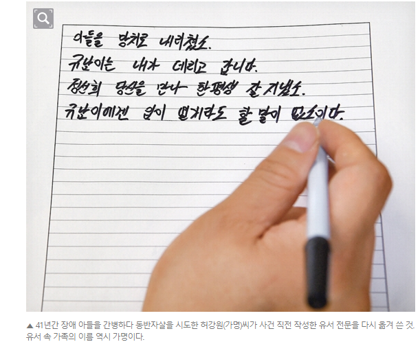 ▲ 41년간 장애 아들을 간병하다 동반자살을 시도한 허강원(가명)씨가 사건 직전 작성한 유서 전문을 다시 옮겨 쓴 것. 유서 속 가족의 이름 역시 가명이다.