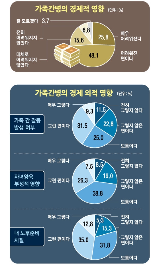 이 밖에 ‘간병으로 시간이 없어 일상생활에 영향을 받았다’는 답변도 63.5%나 나왔다. ‘노후 준비에 어려움을 겪는다’(47.8%)거나 ‘자녀 양육에 지장이 있다’(33.8%)는 호소도 있었다.