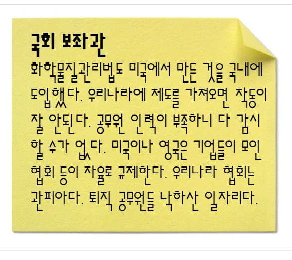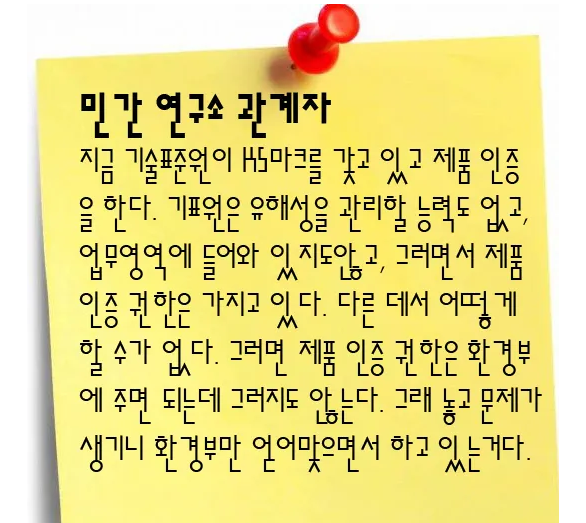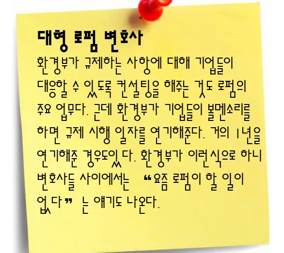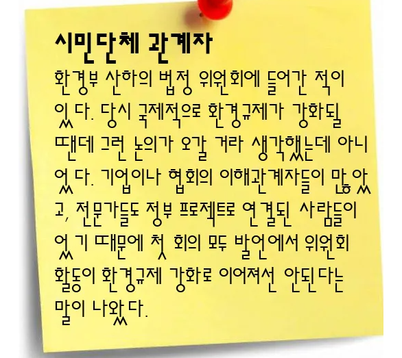 화평법 제정에 앞장서다 기업의 목소리를 내는 쪽으로 돌아선 공무원도 있다. 화평법 제정 담당 부서인 환경부 화학물질과 이지윤 과장은 2014년 1300여개의 화학물질 제조·수입·사용 업체가 속해 있는 한국화학물질관리협회의 상근 부회장으로 자리를 옮겼다. 이후 이 과장은 “중소기업이 화평법을 이행하기 어려운 실정”이라며 업계 쪽 입장을 대변하고 있다.