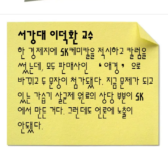 “가습기 살균제 사건 이후 관련 논문을 써서 외국 학술지에 발표하려 했더니, 외국 사람들이 일반적으로 일어날 수 있는 상황이 아니라며 반려했다. 화학물질을 가습기에 넣어 세균을 없애야 된다는 놀라운 생각을 한 건 한국 밖에 없었다.”