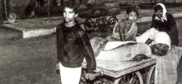 인도 보팔 1984년 12월2일 인도의 보팔에서 일어난 화학물질 누출사고 피해자를 가족들이 수레에 실어 옮기고 있다. 당시 미국 유니온카바이드의 살충제 공장에서 유독한 메틸이소시안염 가스 40t이 누출돼 2259명이 즉사했고 지금까지 2만여명이 후유증으로 더 사망했다. <보팔 피해자 지원단체 보팔메디컬어필 제공>