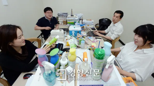 경향신문 ‘毒한 사회 - 생활화학제품의 역습’ 특별취재팀 기자들이 지난 12일 4개월간 ‘취재 캠프’로 썼던 편집국 회의실에서 기사에 등장한 스프레이 제품들을 보며 취재 과정 뒷얘기와 시민·기업·정부에 하고 싶었던 얘기를 나누고 있다. 왼쪽부터 이혜인·김기범·이효상·이혜리 기자. 김정근 기자 jeongk@kyunghyang.com