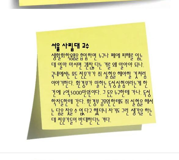 김기범 = 기준치 이하면 괜찮다는 사고방식을 기업이나 정부가 사람들에게 주입하는데 과학적인 척하는 비과학적인 이야기다. 쥐와 사람이 다르고, 사람마다 민감도가 다른 걸 무시한 거다.