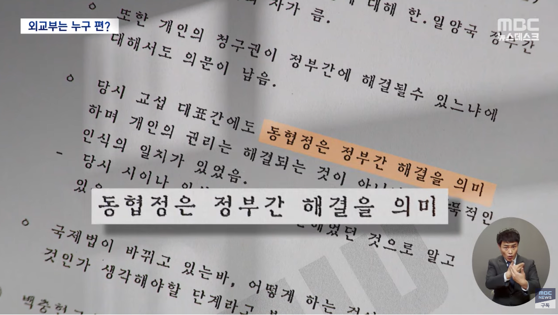1965년 한·일 청구권 협정은 "정부 간 해결을 의미하는 것"이고, "개인의 권리는 해결된 게 아니라는 암묵적 인식의 일치가 있었다"는 내용이 담겼습니다.
