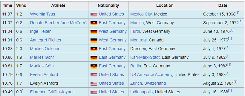 현재 여자 100 미터 세계 기록은, 1988년 서울 올림픽 금메달 소유자인, 플로렌스 그리피스 조이너 (Florence Griffith Joyner)가 1988년 7월 16일에 세운 10.49 이다.