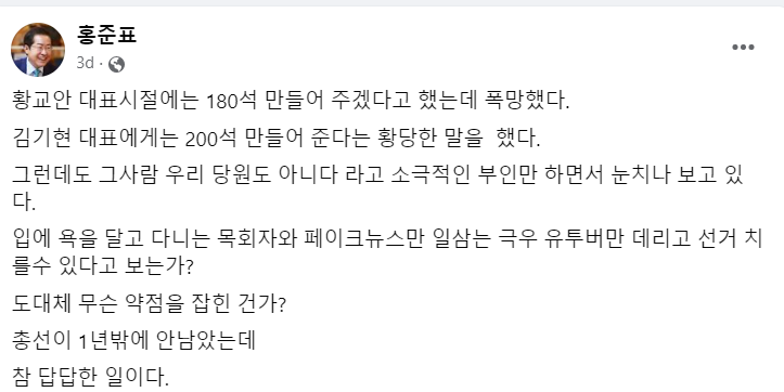 김기현 대표에게는 200석 만들어 준다는 황당한 말을 했다.