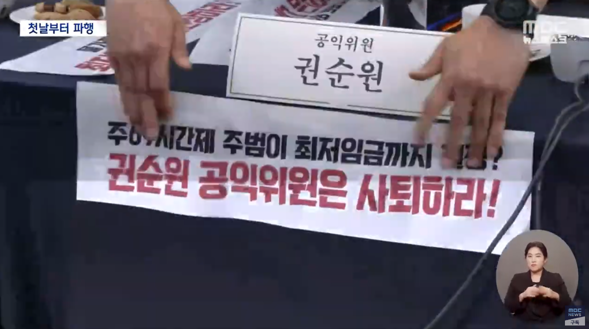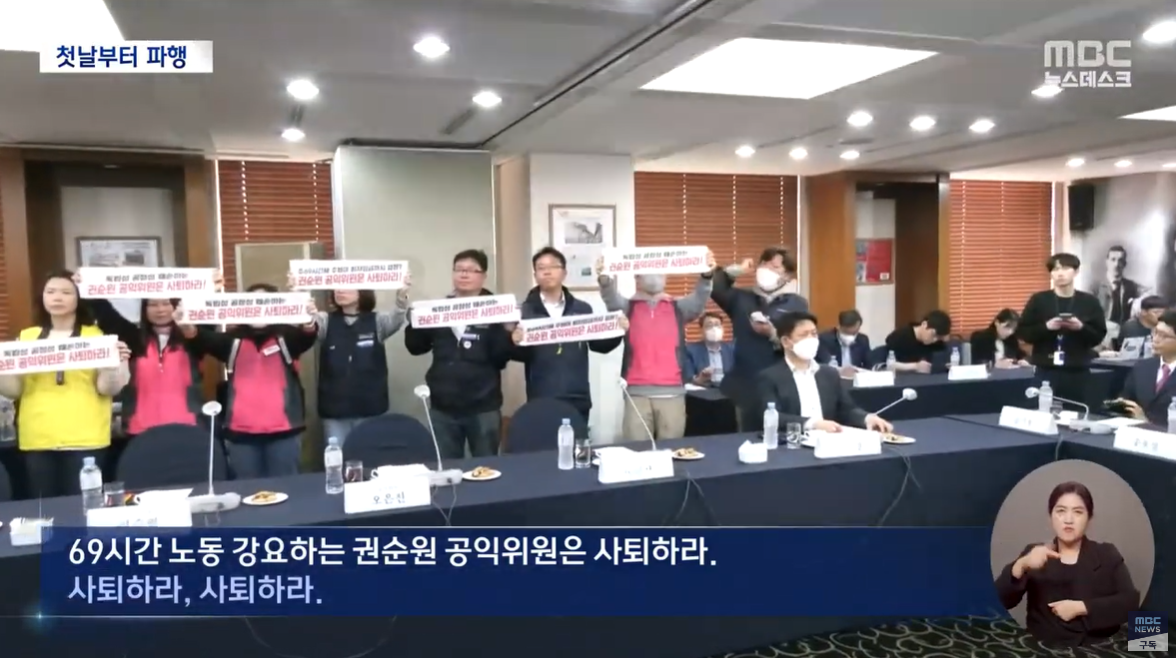 "69시간 노동 강요하는 권순원 공익위원은 사퇴하라. <사퇴하라, 사퇴하라.>"