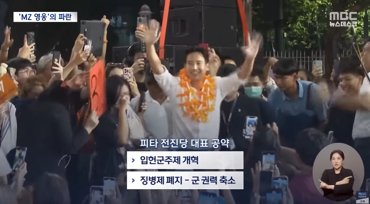 국왕 중심의 입헌 군주제 개혁과 왕실모독죄와 징병제 폐지 등을 공약으로 내세우며 2030 젊은 세대의 표심을 사로잡은 전진당이 하원 500석의 총선에서 제1당이 됐습니다.