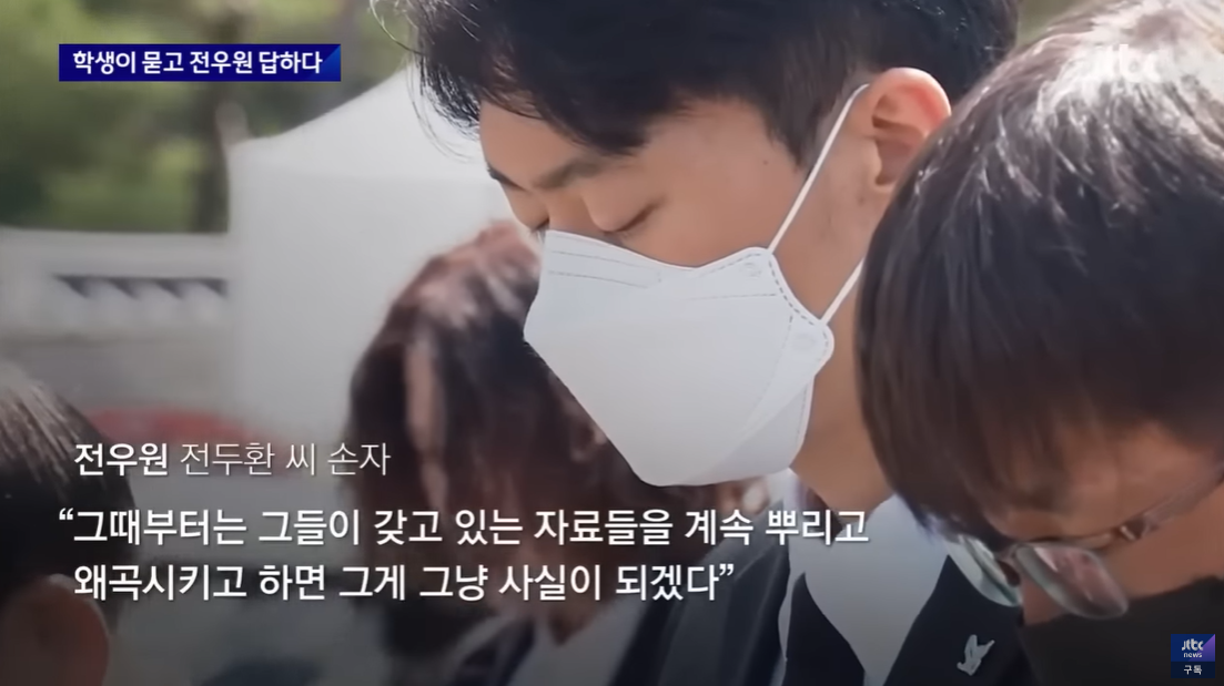 5·18에 대한 왜곡을 사실 가장 많이 접했던 사람은 아마 전두환 씨의 가족일 겁니다. 네. 전두환 씨의 손자, 전우원씨 얘기입니다. 전 씨의 가족 중 유일하게 광주에 사과했던 전우원 씨가 5·18을 맞아 광주에서 학생들과 만났습니다. 전우원 씨는 왜곡이 계속되는 건, 진실을 기억하는 사람이 모두 사라지면 왜곡이 진실이 되기 때문이라고 했습니다.