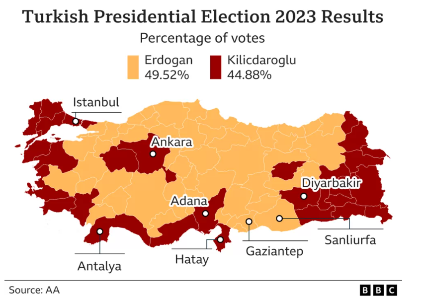 Turkish Presidential Election 2023 Results map with percentage of votes