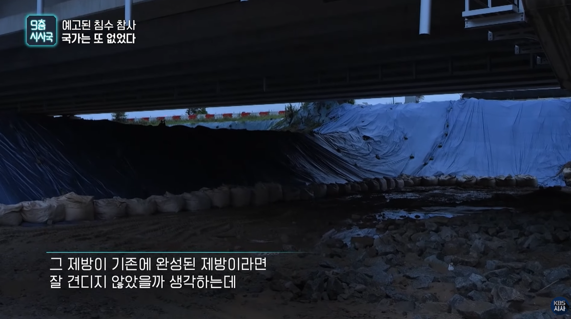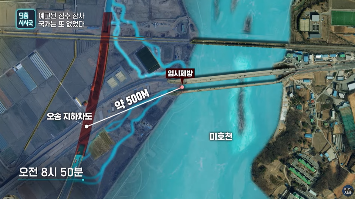 kbs 취재 보도에 따르면, 궁평 지하차도로 물이 유입된 원인은 미호천 강변에 쌓아둔 임시제방이 무너졌기 때문이다.