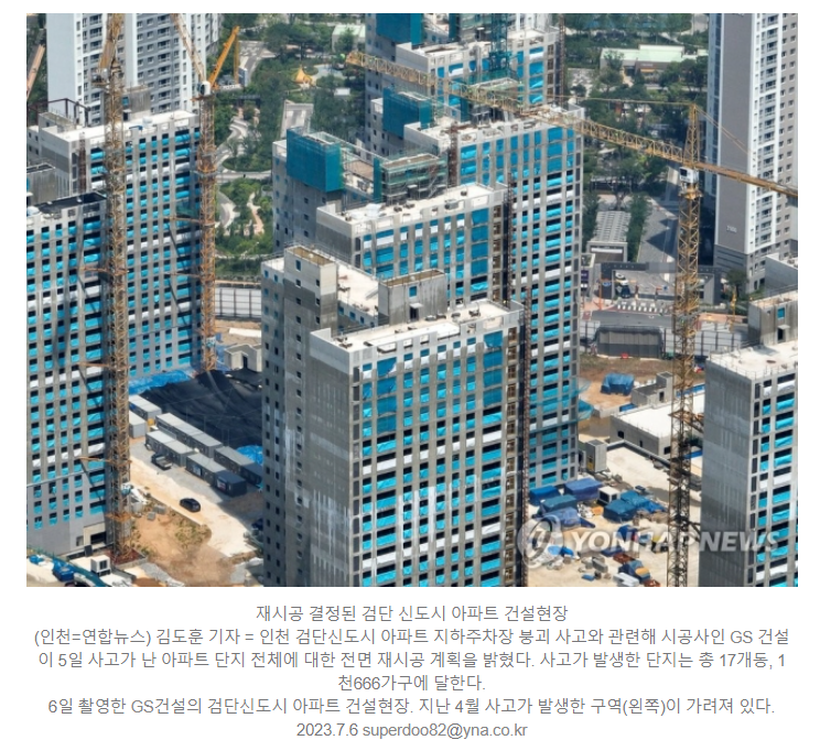 (인천=연합뉴스) 김도훈 기자 = 인천 검단신도시 아파트 지하주차장 붕괴 사고와 관련해 시공사인 GS 건설이 5일 사고가 난 아파트 단지 전체에 대한 전면 재시공 계획을 밝혔다. 사고가 발생한 단지는 총 17개동, 1천666가구에 달한다.