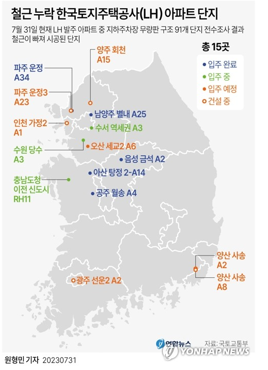 (서울=연합뉴스) 박초롱 기자 = 파주 운정, 남양주 별내, 아산 탕정, 양주 회천 등 지하주차장 철근을 빠뜨린 한국토지주택공사(LH) 아파트 15개 단지가 공개됐다.