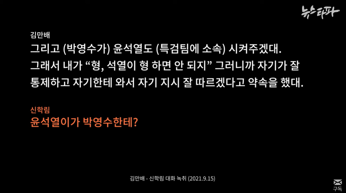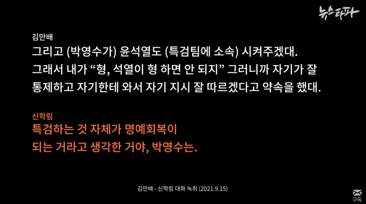 김만배가 신학림에게, 박영수를 박근혜 특검으로 세우는 데, 자기가 공헌을 했다고 말함.