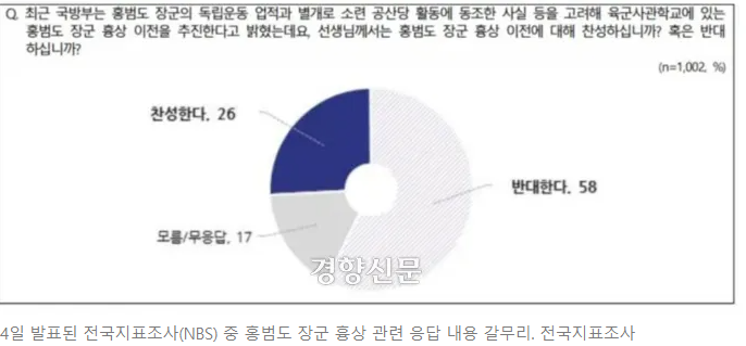 엠브레인퍼블릭·케이스탯리서치·코리아리서치·한국리서치가 지난 11일부터 13일까지 3일 동안 만18세 이상 1002명 대상으로 진행한 전국지표조사(NBS) 결과 홍범도 장군 흉상 이전에 반대한다는 응답 비율이 58%로 나타났다. 찬성 응답(26%)보다 2배 이상 높은 수치다.