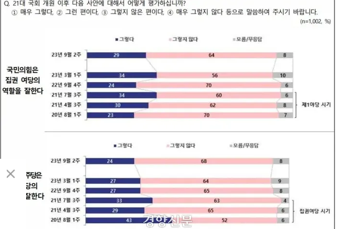 21대 국회에 대해서는 응답자 대부분이 부정 의견을 보였다. 국민의힘이 집권 여당 역할을 잘한다는 응답은 29%, 더불어민주당이 제1야당 역할을 잘한다는 응답은 24%에 그쳤다. 2주 전 발표된 직전 조사 대비 각각 5%P, 3%P 하락한 수치다. 반면 각 정당이 역할을 잘 하지 못한다는 취지의 응답은 국민의힘 64%, 민주당 68%였다.