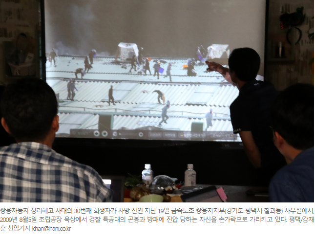 그의 죽음을 접한 남편(지금도 진압 화면을 보면 악몽을 꾸고 소리 지름)이 짐승처럼 울부짖는다고 했습니다. 그들은 모두 10년 전 조립공장 옥상에서 아직 빠져나오지 못한 사람들이었습니다.