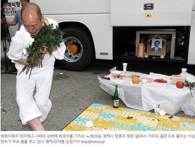 쌍용자동차 정리해고 사태의 30번째 희생자를 기리는 노제(29일, 평택시 쌍용차 정문 앞)에서 ‘거리의 춤꾼’으로 불리는 이삼헌씨가 추모 춤을 추고 있다.