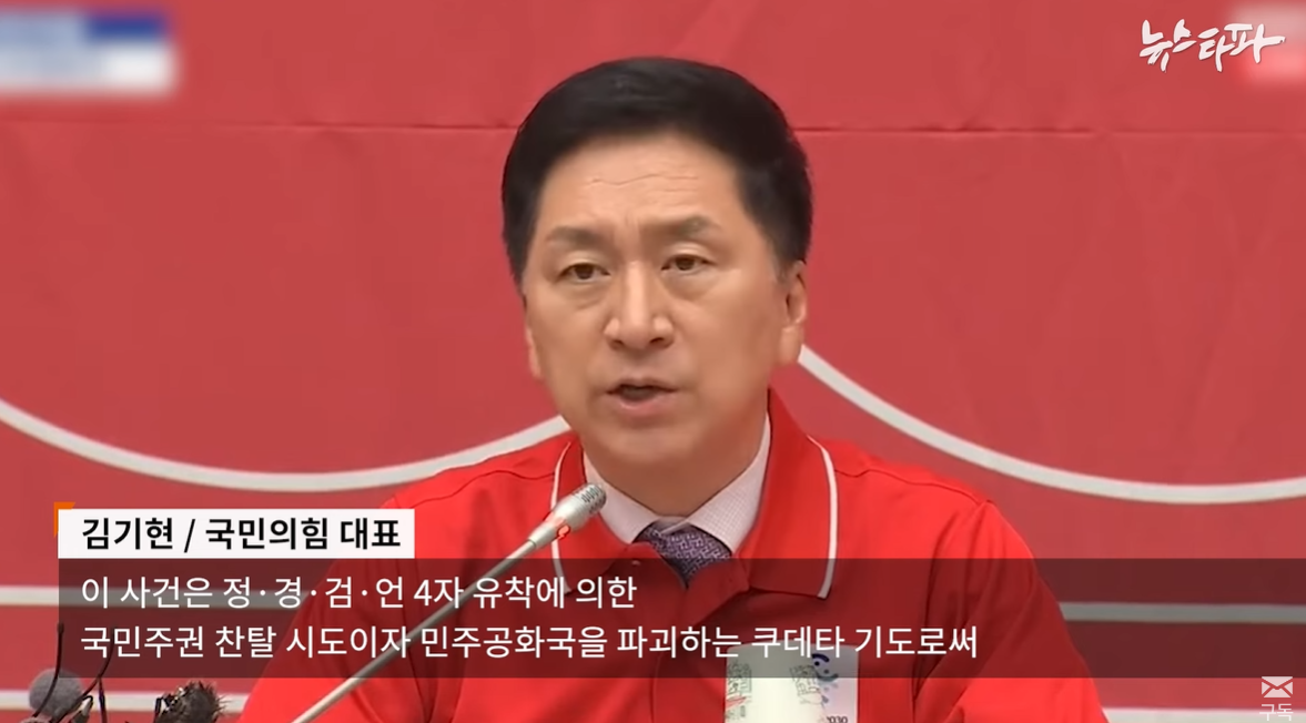 김기현 국민의힘 대표. "이 사건은 정.경.검.언 4자 유착에 의한, 국민주권 찬탈 시도이자 민주공화국을 파괴하는 쿠데타 기로써,