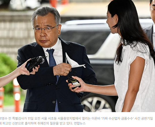 박영수 전 특별검사가 11일 오전 서울 서초동 서울중앙지법에서 열리는 이른바 '가짜 수산업자 금품수수' 사건 공판기일에 피고인 신분으로 출석하며 취재진의 질문을 받고 있다. 연합뉴스