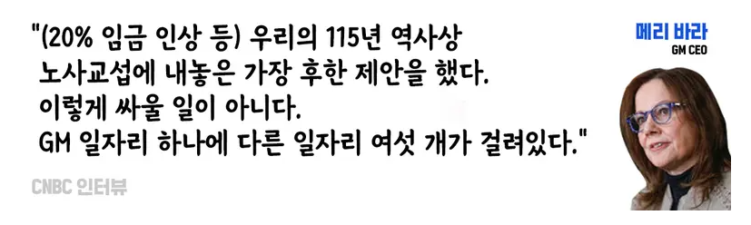 현재 빅3 사측의 얼굴로서 매체에 등장하는 GM의 CEO 메리 바라(Mary Barra)는 CNBC 인터뷰에서 이렇게 얘기했다.