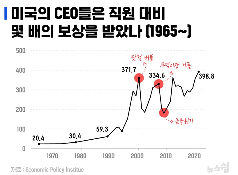 미국 기업의 이익은 사상 최고 수준이고 CEO들의 보상도 그만큼 늘었는데 노동자의 몫은 부당하게 적다는 주장은 미국의 상당수 주류 경제학자들도 인정하는 부분이다. 데이터로도 나타난다. 다음의 그래프들이 우상향 또는 우하향 하는 방향만 대략 봐도 그렇다.