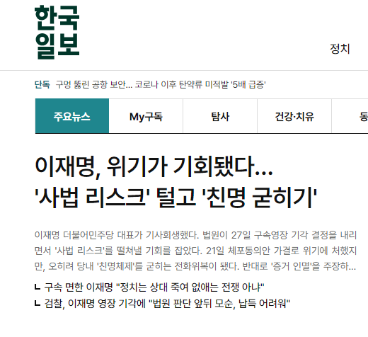 2. 한국 일보. 이재명 체제 강화로 해석.