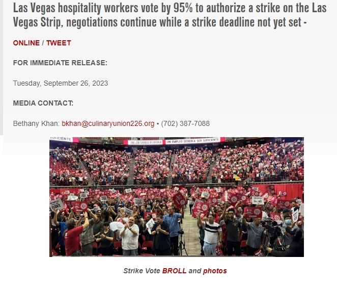 Las Vegas hospitality workers vote by 95% to authorize a strike on the Las Vegas Strip, negotiations continue while a strike deadline not yet set - | escape