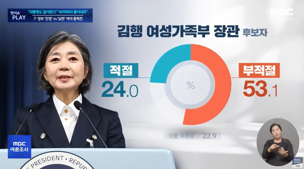김행 여성가족부 장관 후보자, 적절 24%, 부적절 53.1%