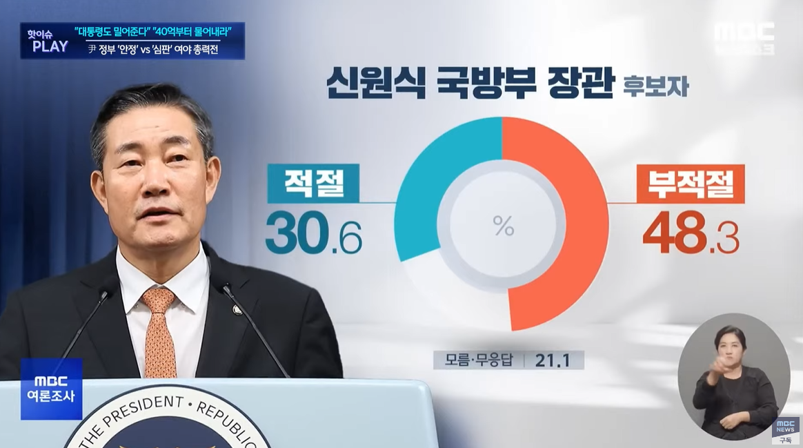 신원식 국방부 장관 후보자 적절 30.6%, 부적절 48.3%