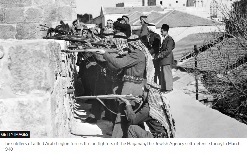 The soldiers of allied Arab Legion forces fire on fighters of the Haganah, the Jewish Agency self-defence force, in March 1948