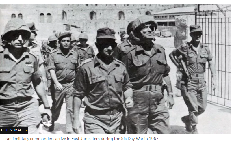 Israeli military commanders arrive in East Jerusalem, after Israeli forces seized East Jerusalem, during the Six Day War 1967