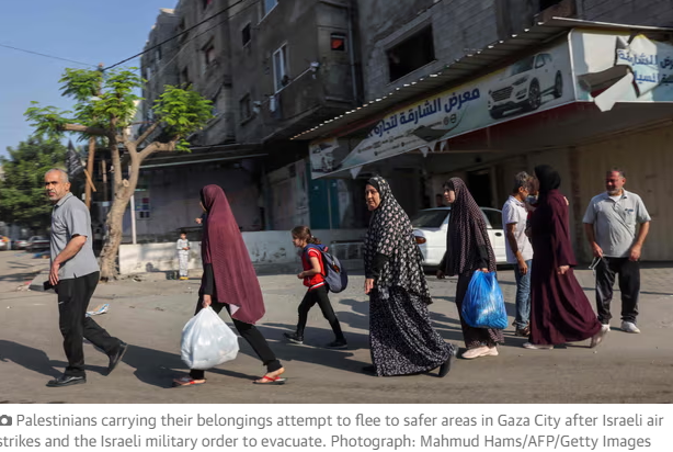 · Israel’s military, the IDF, called for all civilians in Gaza City to evacuate from their homes southwards because it “will operate significantly in Gaza City in the coming days”. It said residents, “will only be able to return to Gaza City when another announcement permitting”.
