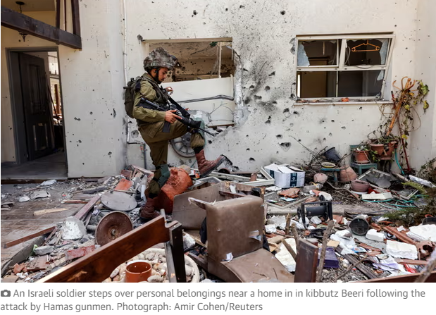 An Israeli soldier steps over personal belongings near a home in in kibbutz Beeri following the attack by Hamas gunmen. Photograph: Amir Cohen/Reuters