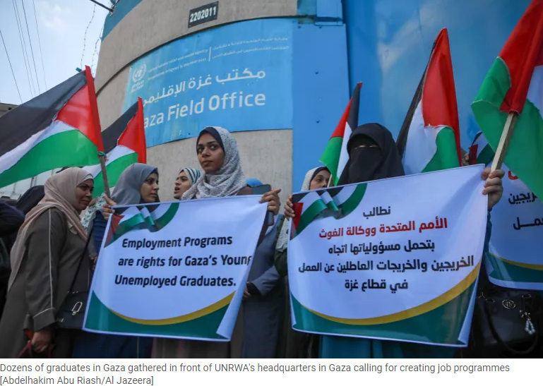 Dozens of graduates in Gaza gathered in front of UNRWA's headquarters in Gaza calling for creating job programmes [Abdelhakim Abu Riash/Al Jazeera]