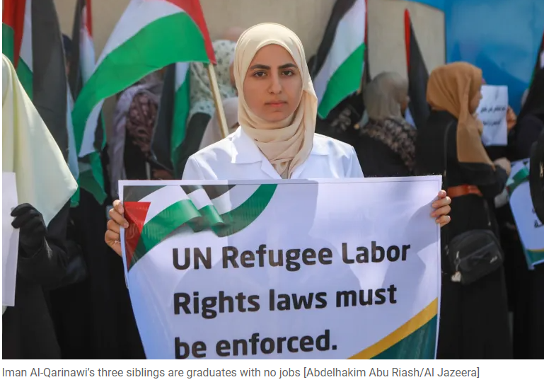 The 32-year-old’s frustration took her last week to a protest in front of the headquarters of the United Nations Relief and Works Agency for Refugees (UNRWA), where demonstrators demanded the body provide more job opportunities in Gaza, and an end to the blockade imposed on the enclave by Israel.