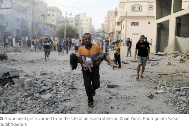 om the site of an Israeli strike on Khan Yunis. Photograph: Yasser Qudih/Reuters
