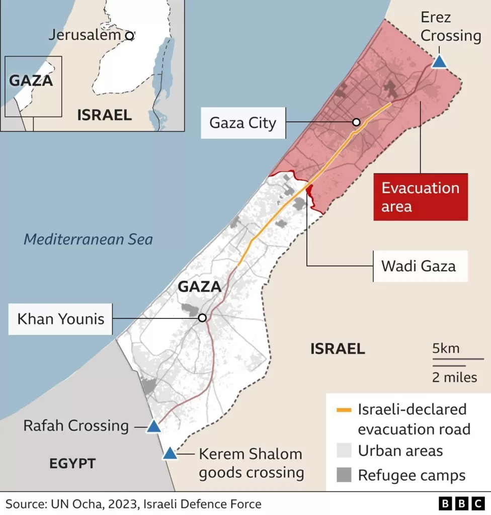 하바스 발표. 이스라엘 군대의 명령 이후, 가자 지구 북쪽에 거주하는 110만 주민들 중, 40만명이 지난 48시간 이내에 살라 알-딘 도로를 따라 남쪽으로 피난을 떠났다.