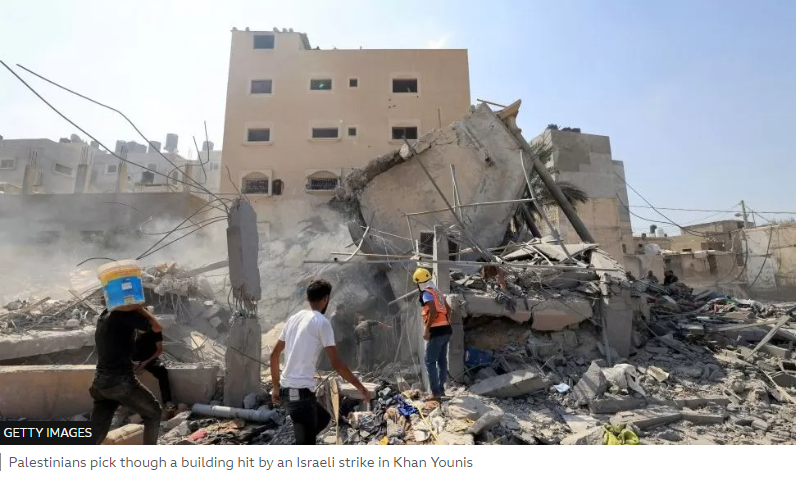Palestinians pick though a building hit by an Israeli strike in Khan Younis