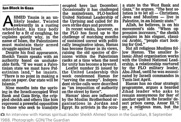 이러한 야신의 계산은 1988년 하마스 헌장에 그대로 기록되었다. 하마스는 무슬림 형제단의 한 날개다.