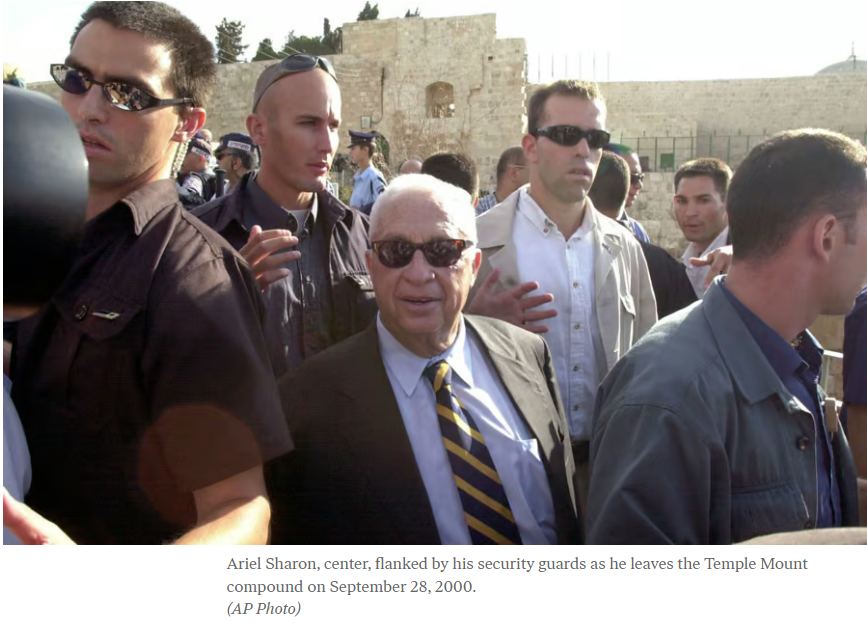 28 Sept. 2000 Ariel Sharon visits Temple Mount. Outbreak of the Al-Aqsa intifada.
